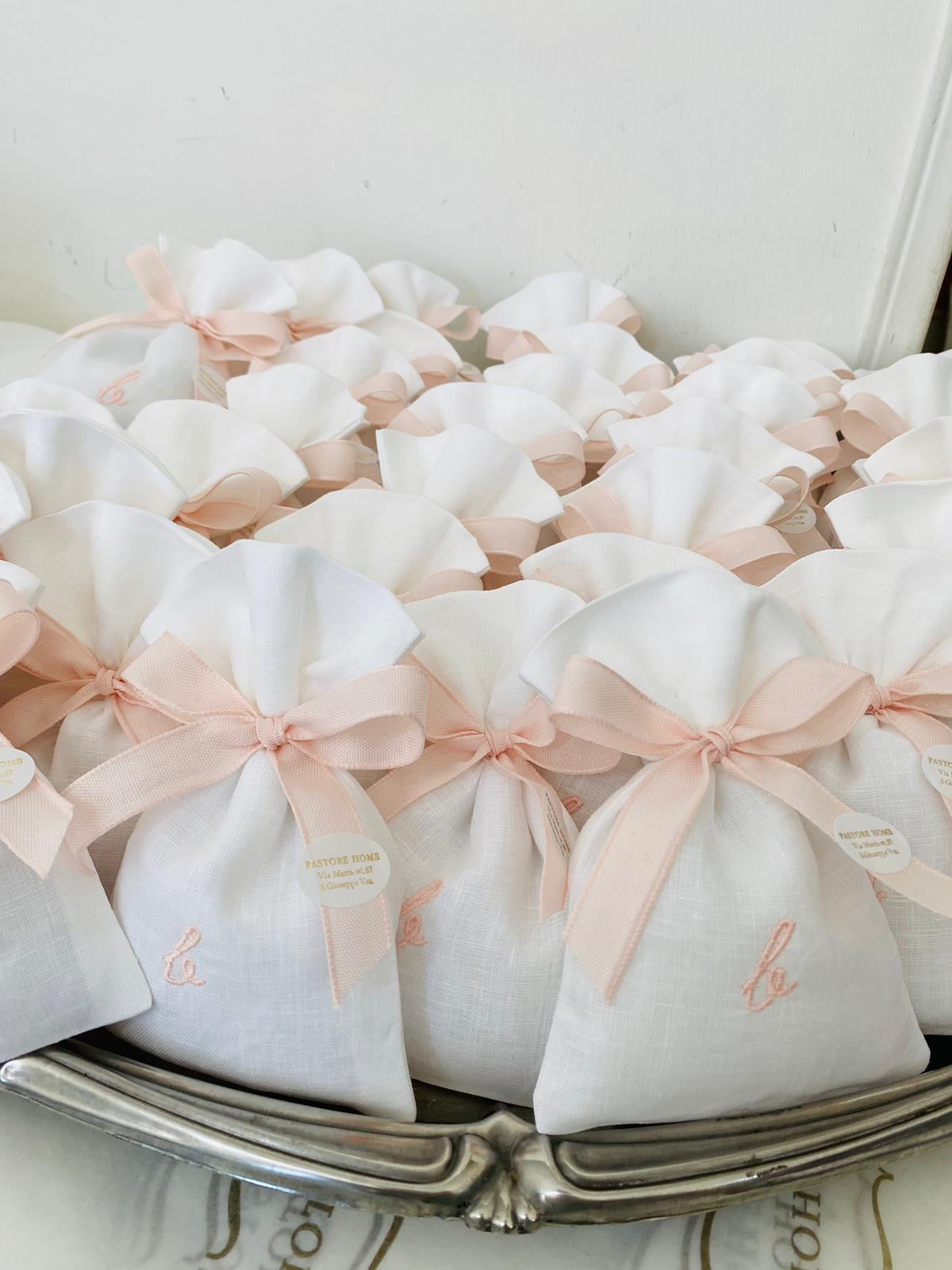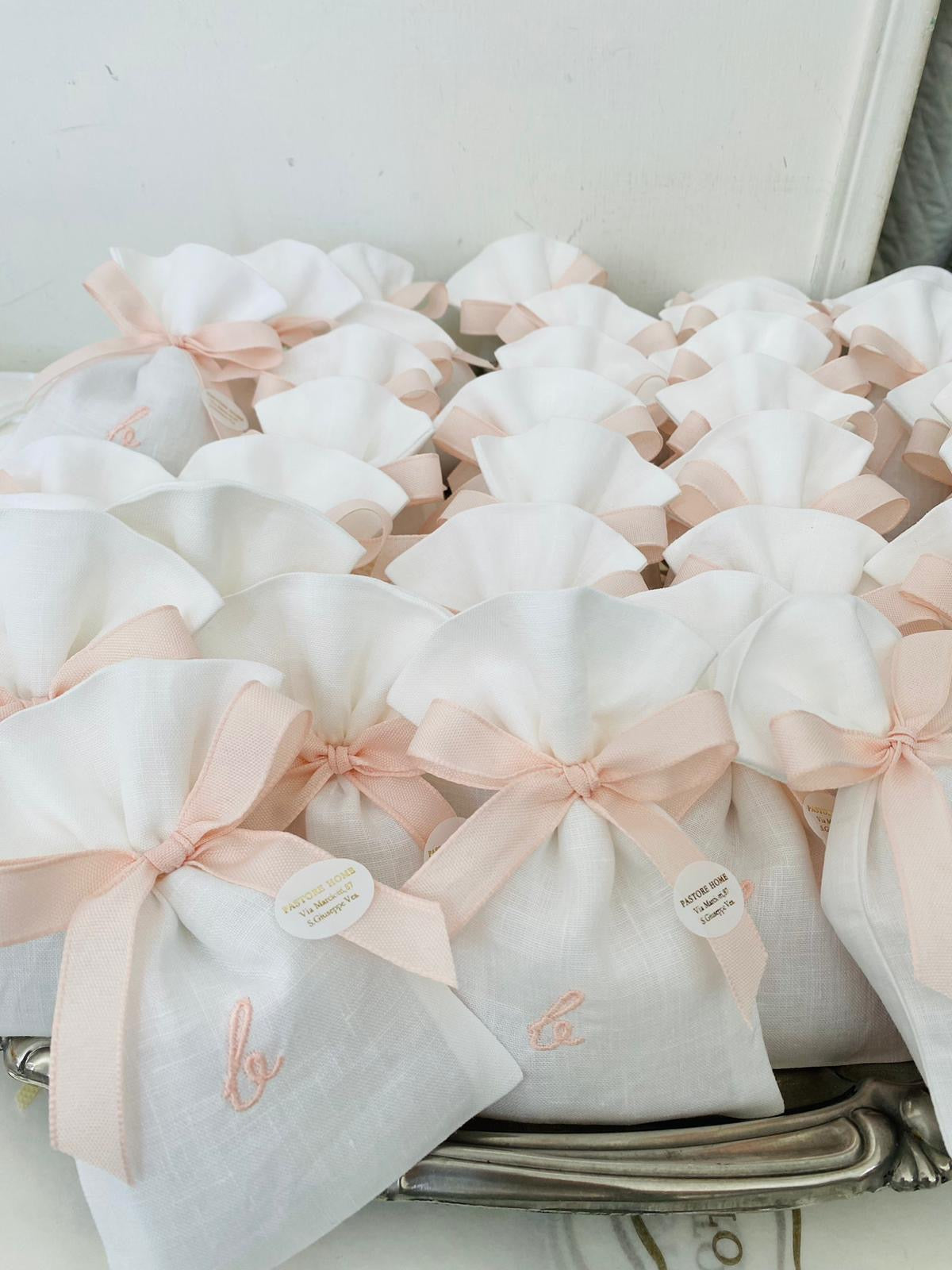 Un sacchetto realizzato a mano in puro lino 100%, pensato per celebrare con grazia l’arrivo di una nuova vita.Morbido al tatto, impreziosito da un fiocco in tessuto e personalizzabile con iniziali ricamate a macchina è l’emblema di uno stile sobrio, raffinato e senza tempo.