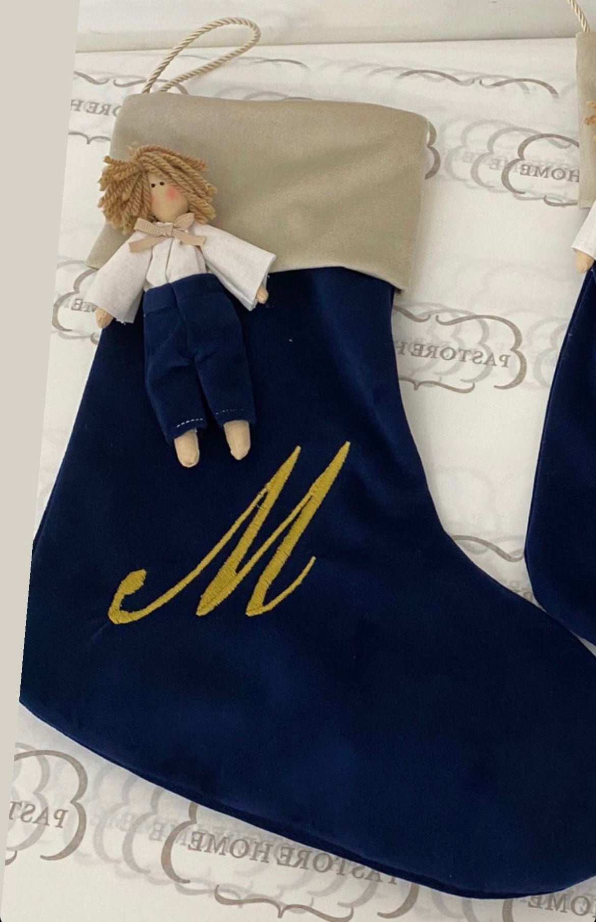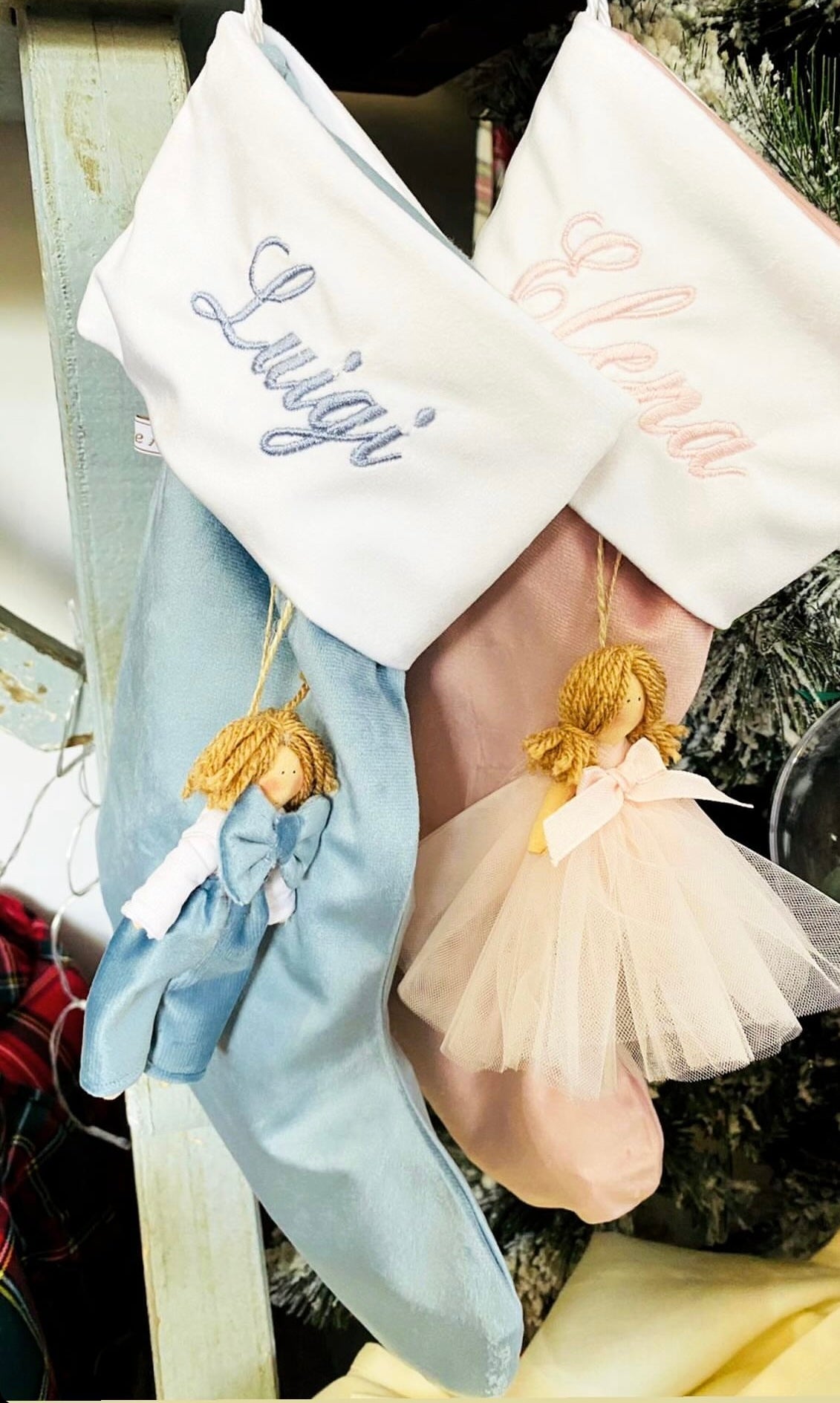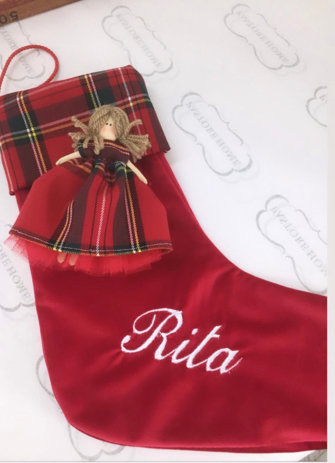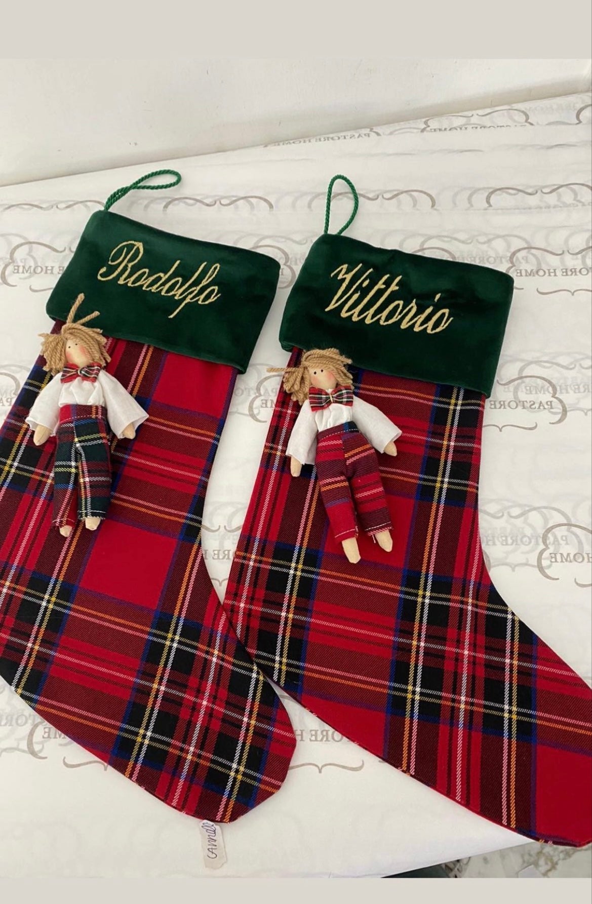 Calza sartoriale in velluto o tartan nelle misure: Piccola H30cm Media H37cm Grande H46cm. Con dettaglio bambolina di pezza fatta a mano. Nel prezzo è inclusa la personalizzazione.