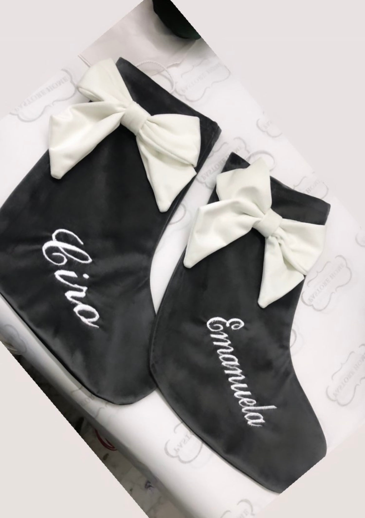 Calza sartoriale in velluto o tartan con fiocco applicato. Misura: Piccola H30cm Media H37cm Grande H46cm. Nel prezzo è inclusa la personalizzazione.