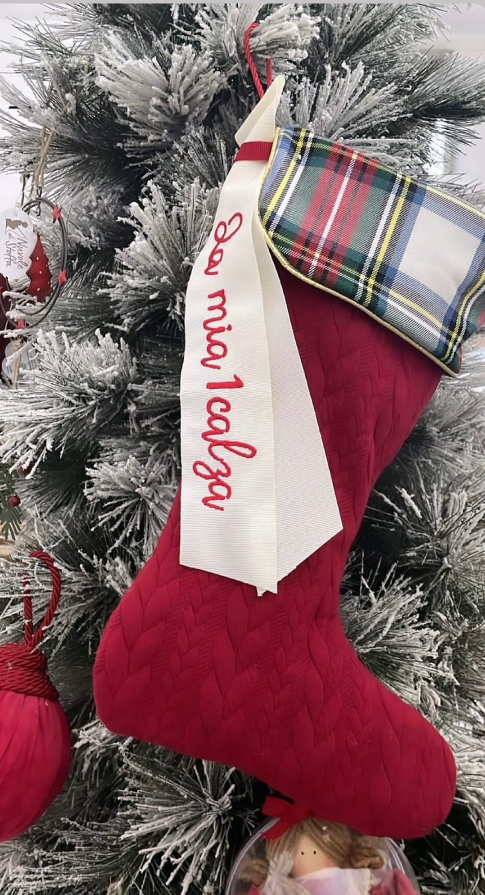 Calza treccia con risvolto con profilo, nastro personalizzabile con nomi o inziali.