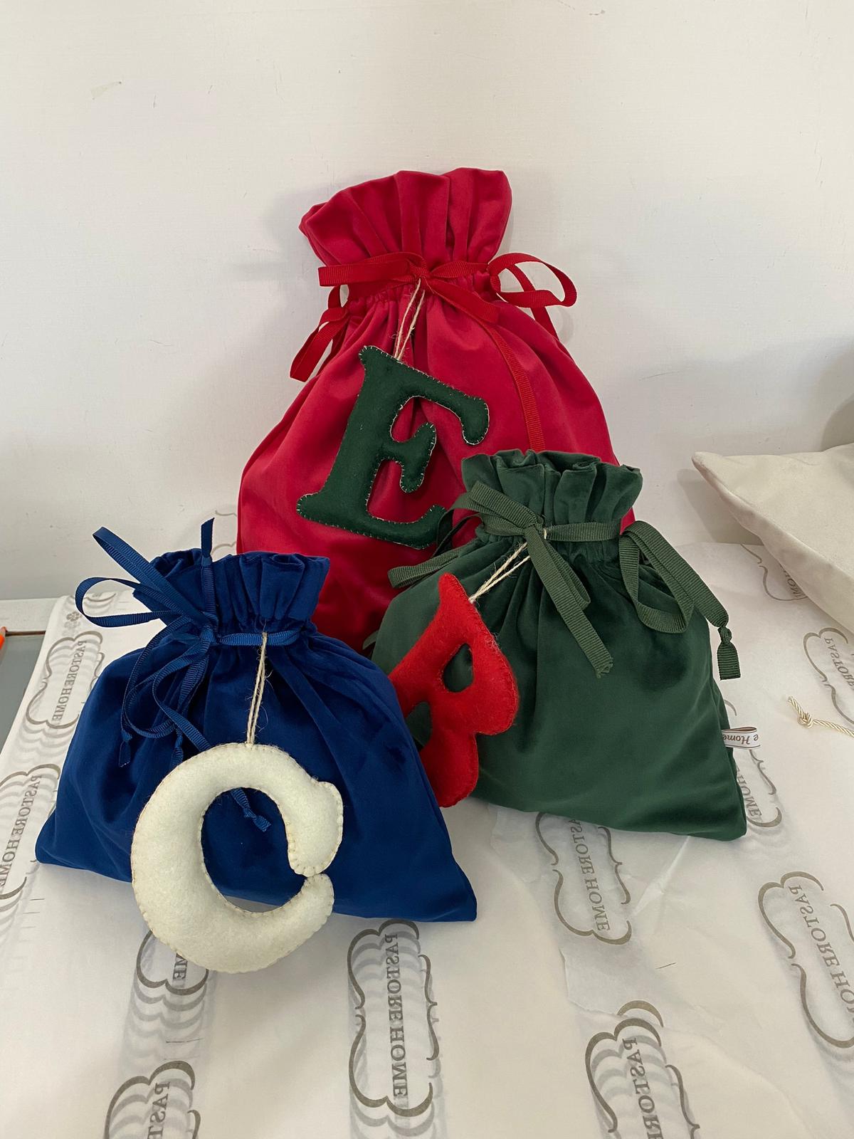 Sacco in velluto o tartan con coulisse più lettera pendente in pannolenci. Misura 35x33 circa
