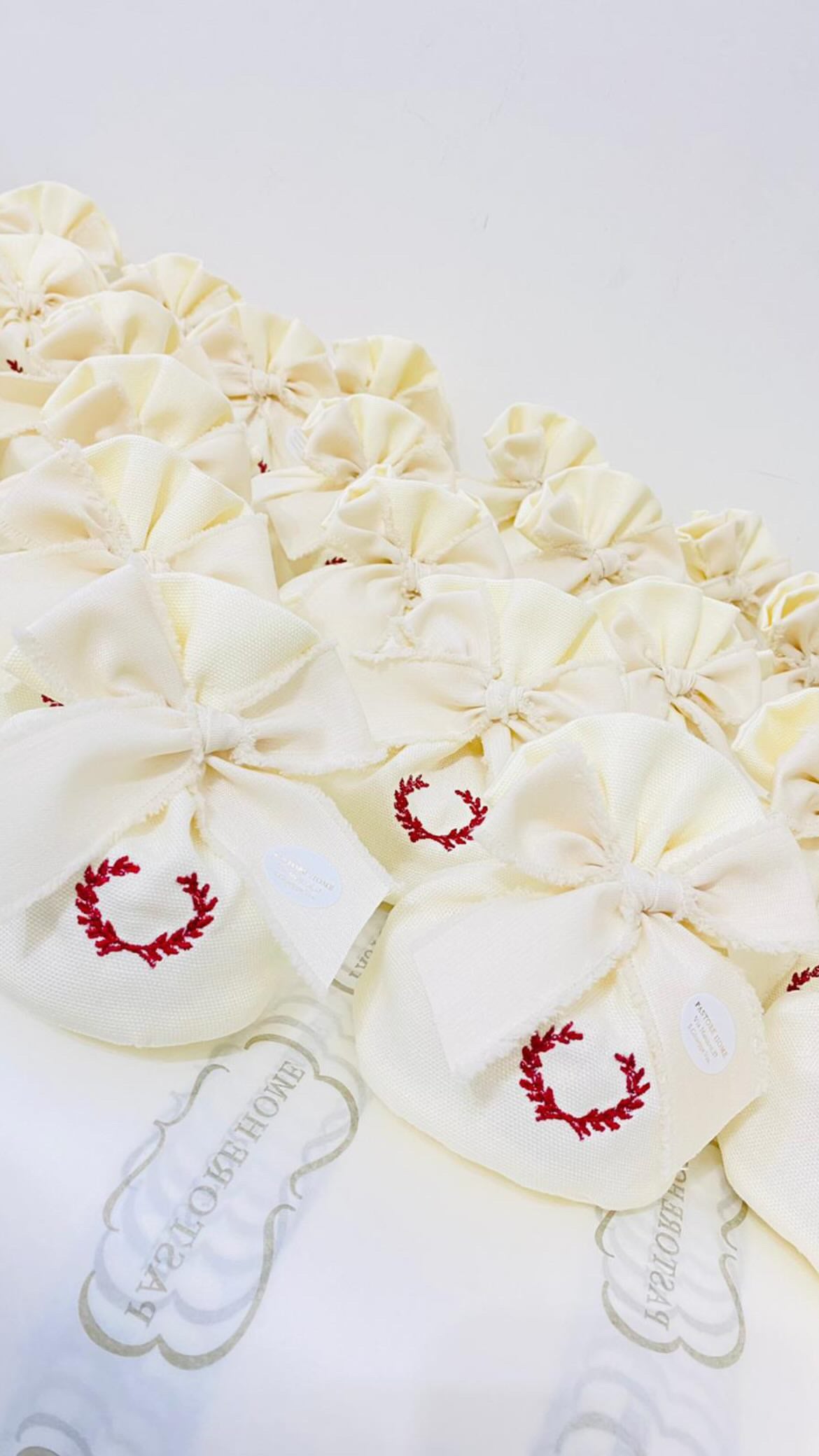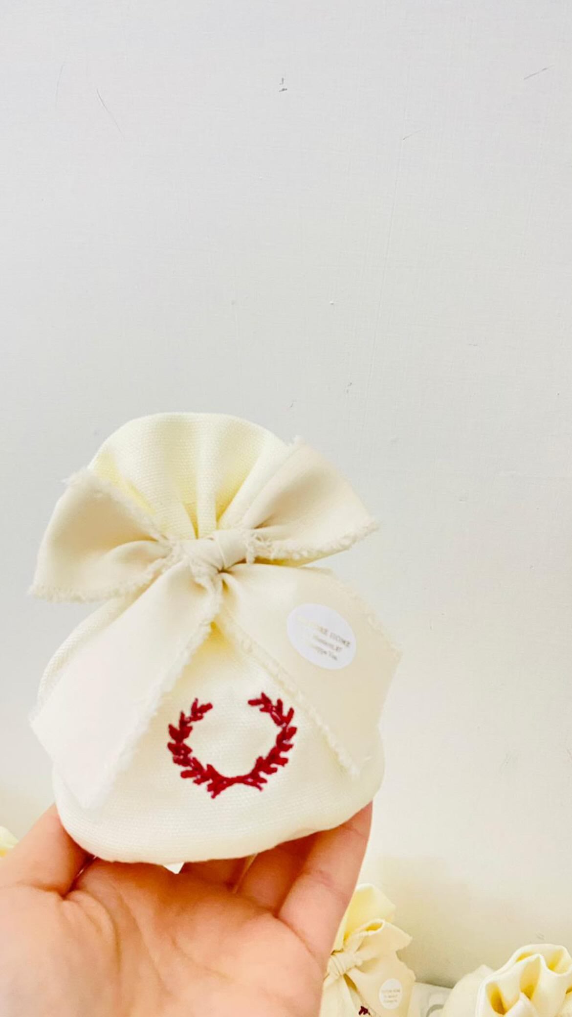 Questo sacchetto tondo, realizzato sartorialmente in cotone 100% , è pensato per custodire i tuoi confetti con stile e raffinatezza. Perfetto per bomboniere di laurea, è impreziosito da un delicato ricamo a ghirlanda che abbraccia il cuore del sacchetto, rendendolo un dono unico.