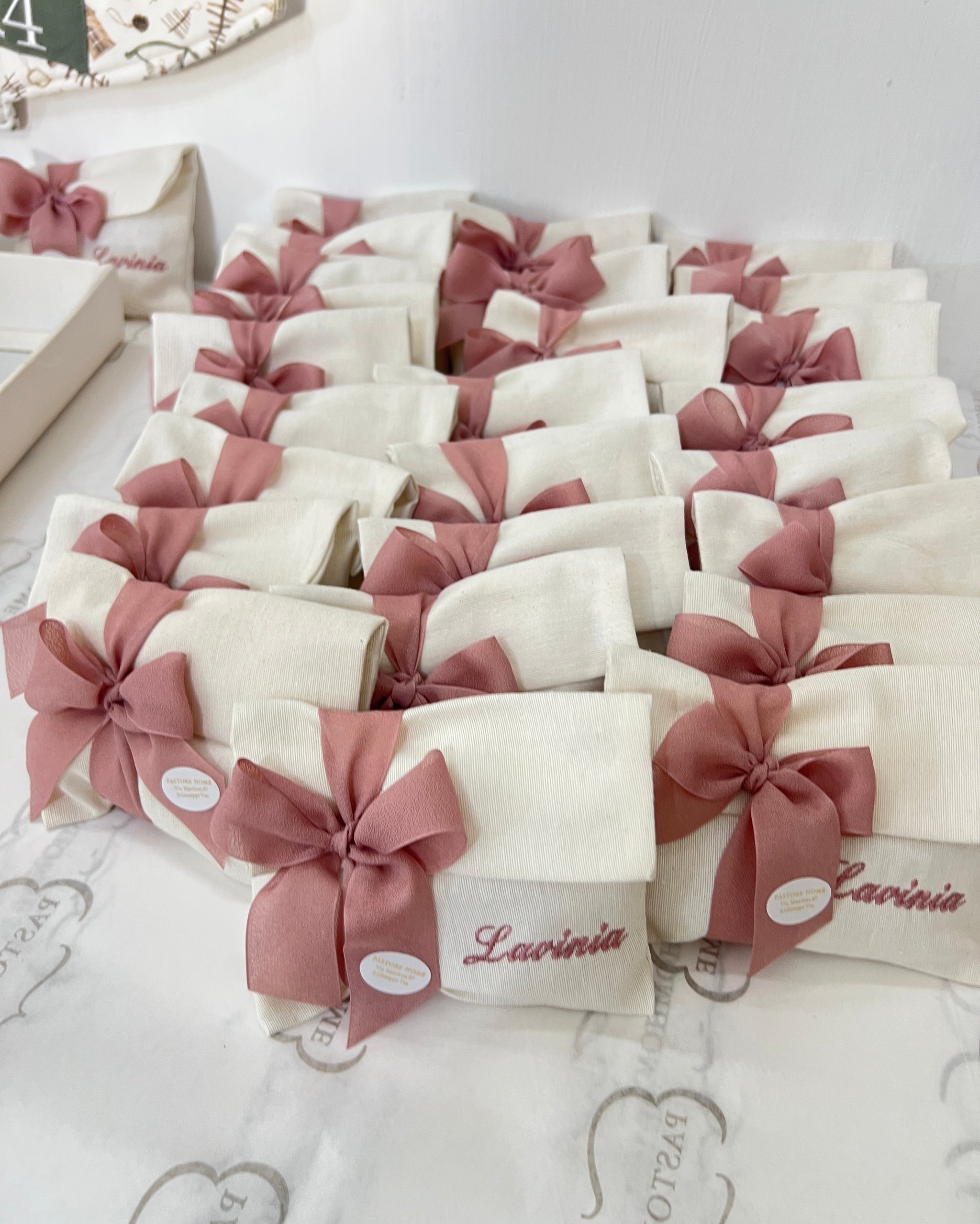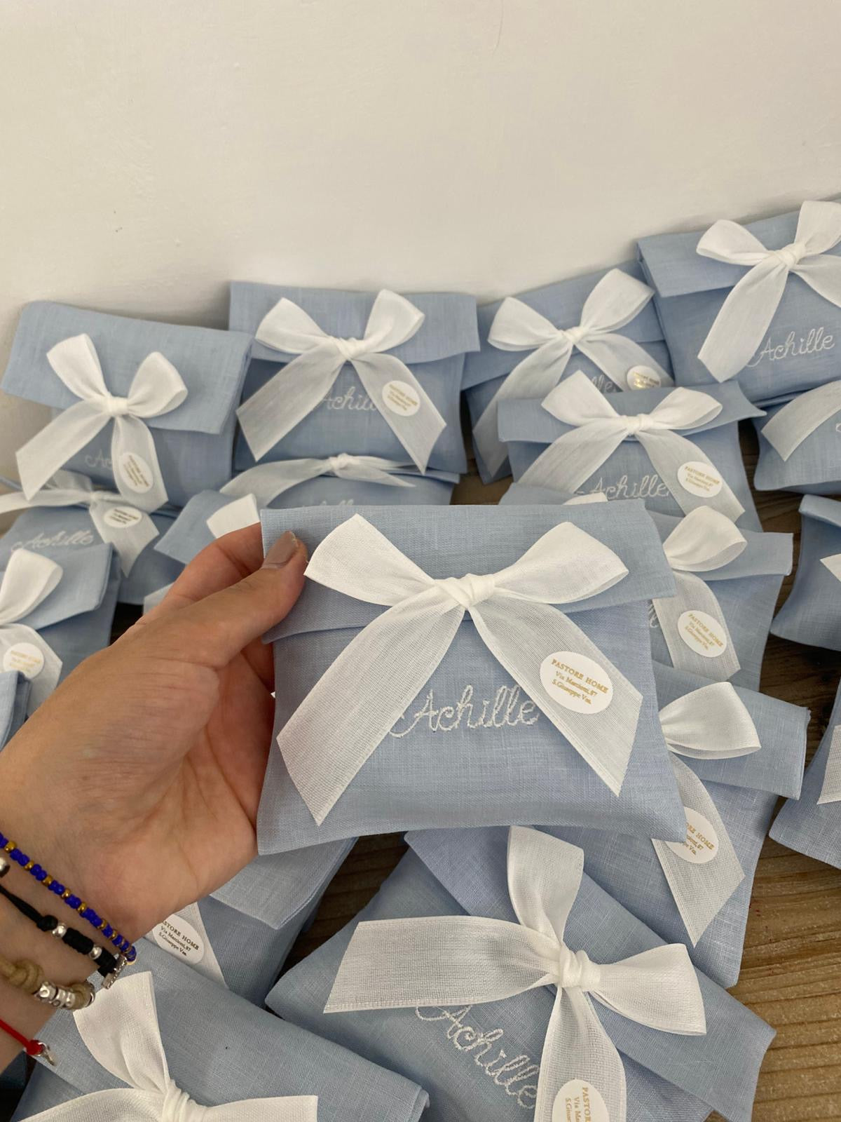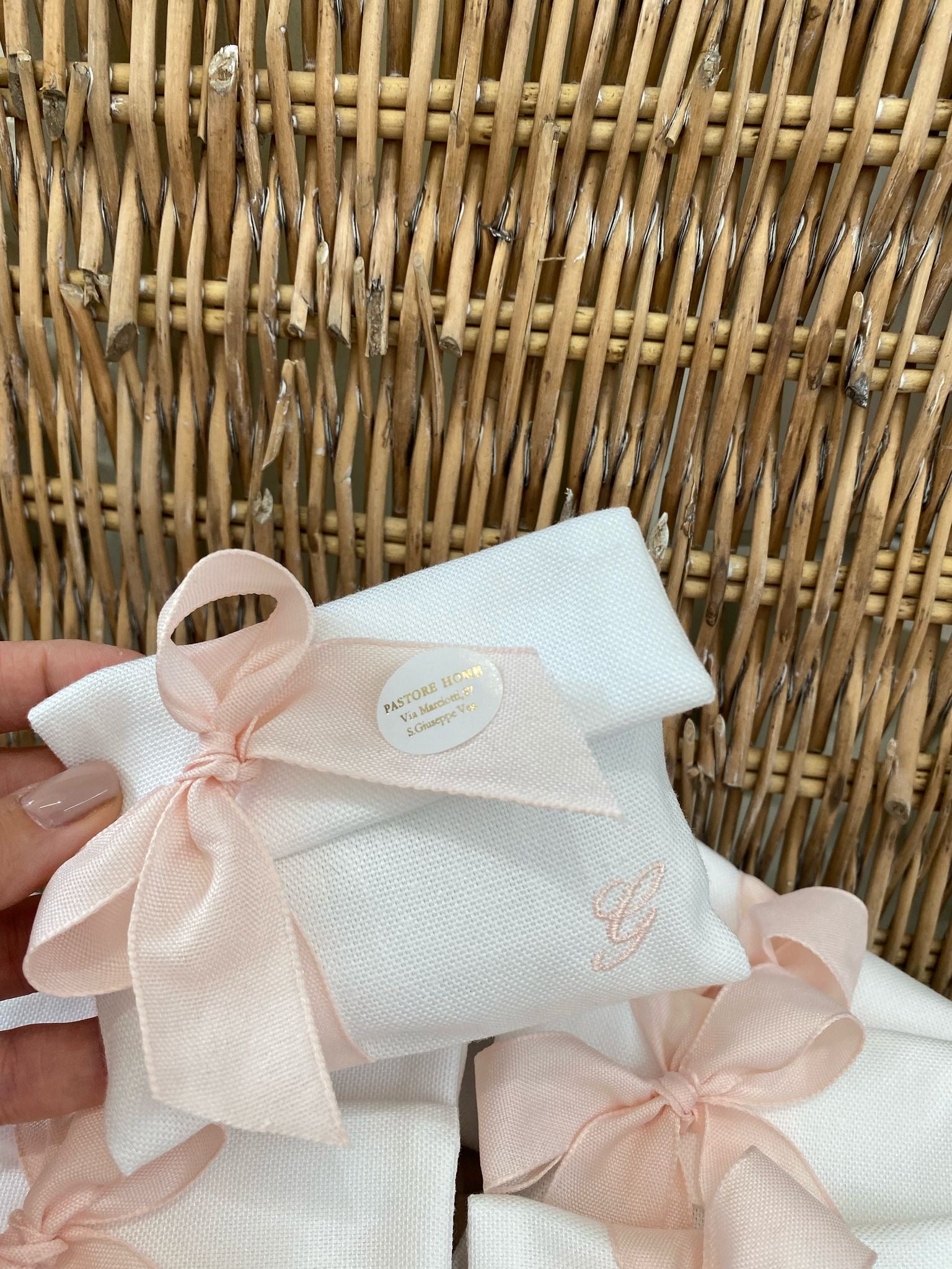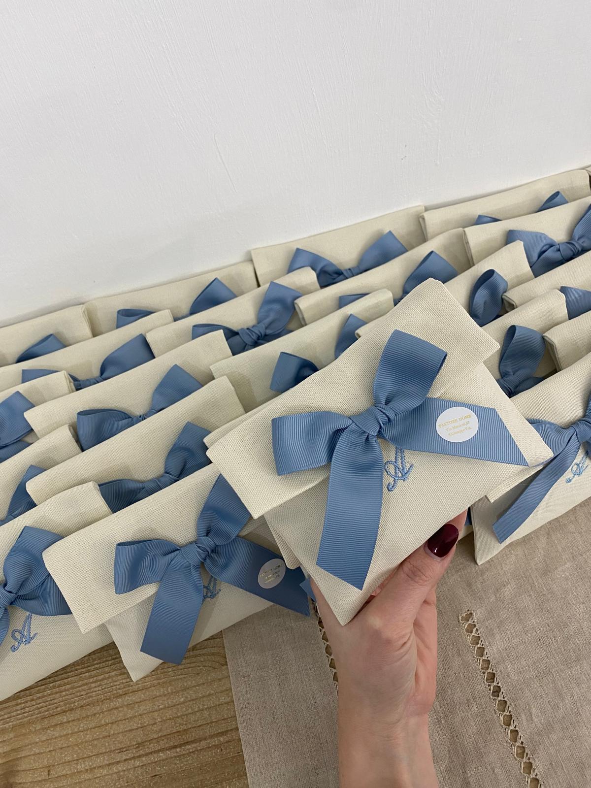 Bustina porta confetti in cotone 100%  ideale per tutti i tuoi eventi. Il prezzo è compreso di 5 confetti, biglietto e ricamo di nome o iniziali. Fiocco tessuto casuale