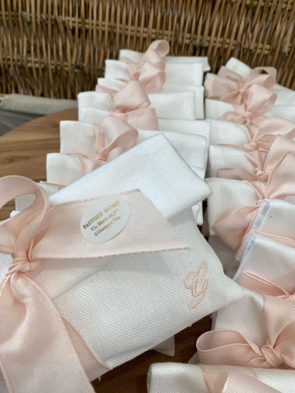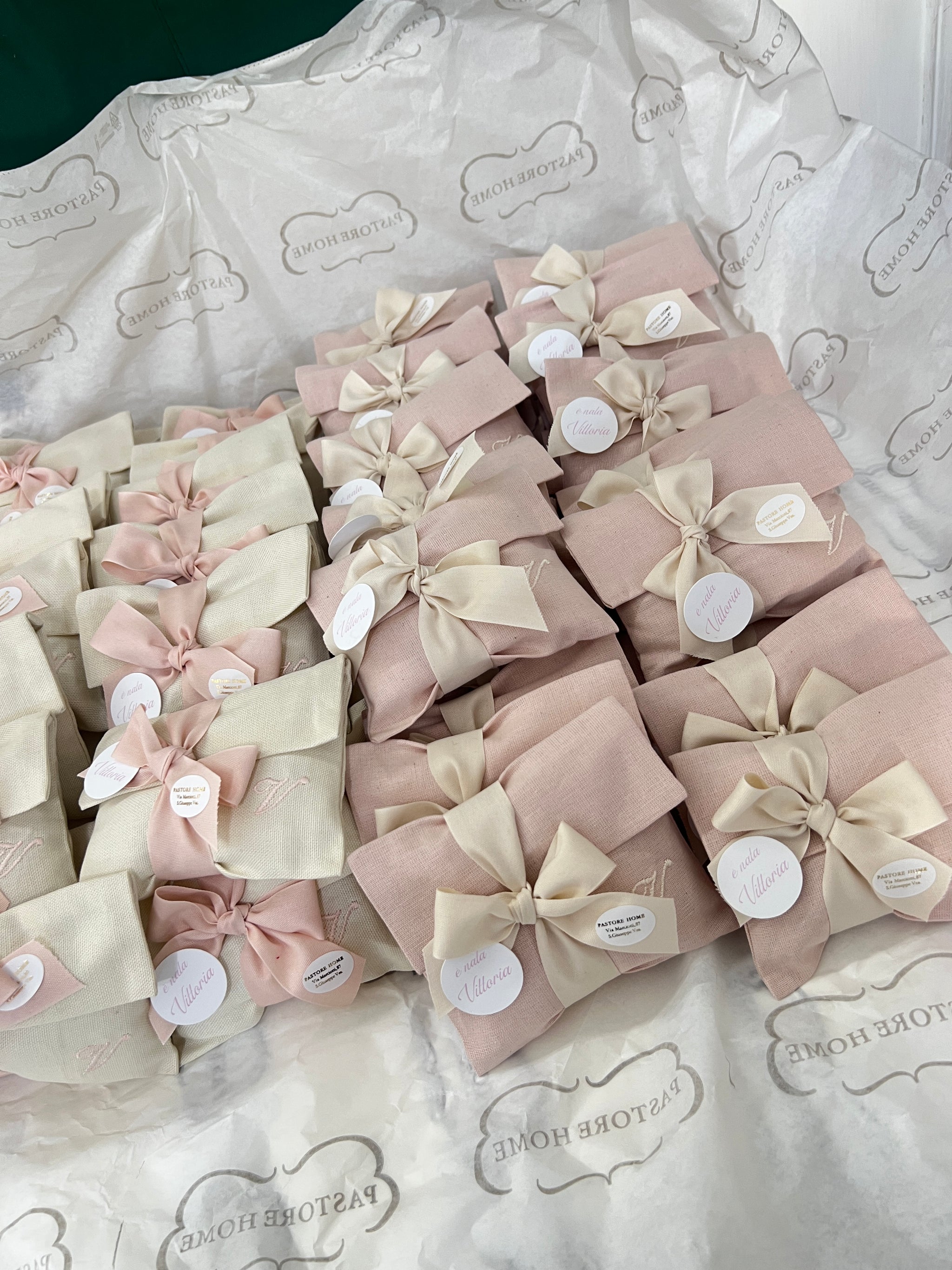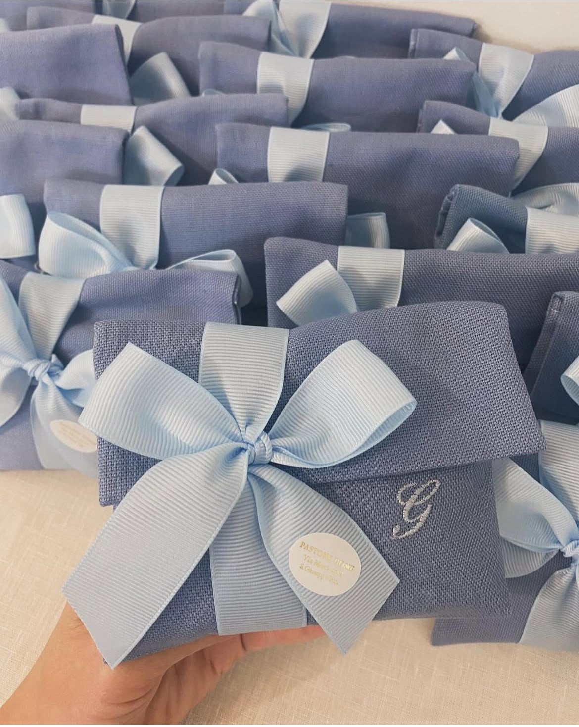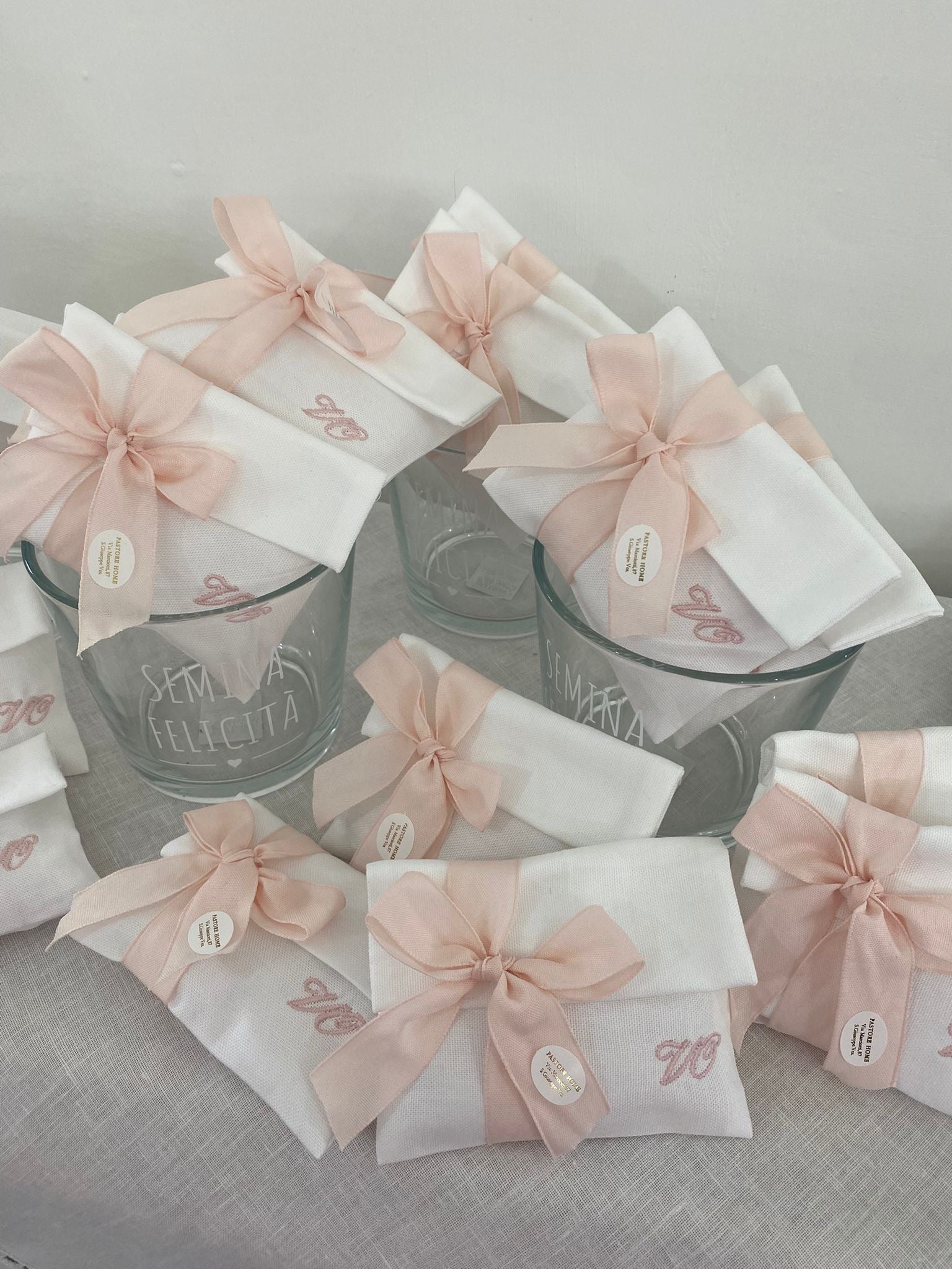 Bustina porta confetti in cotone 100%  ideale per tutti i tuoi eventi. Il prezzo è compreso di 5 confetti, biglietto e ricamo di nome o iniziali. Fiocco tessuto casuale