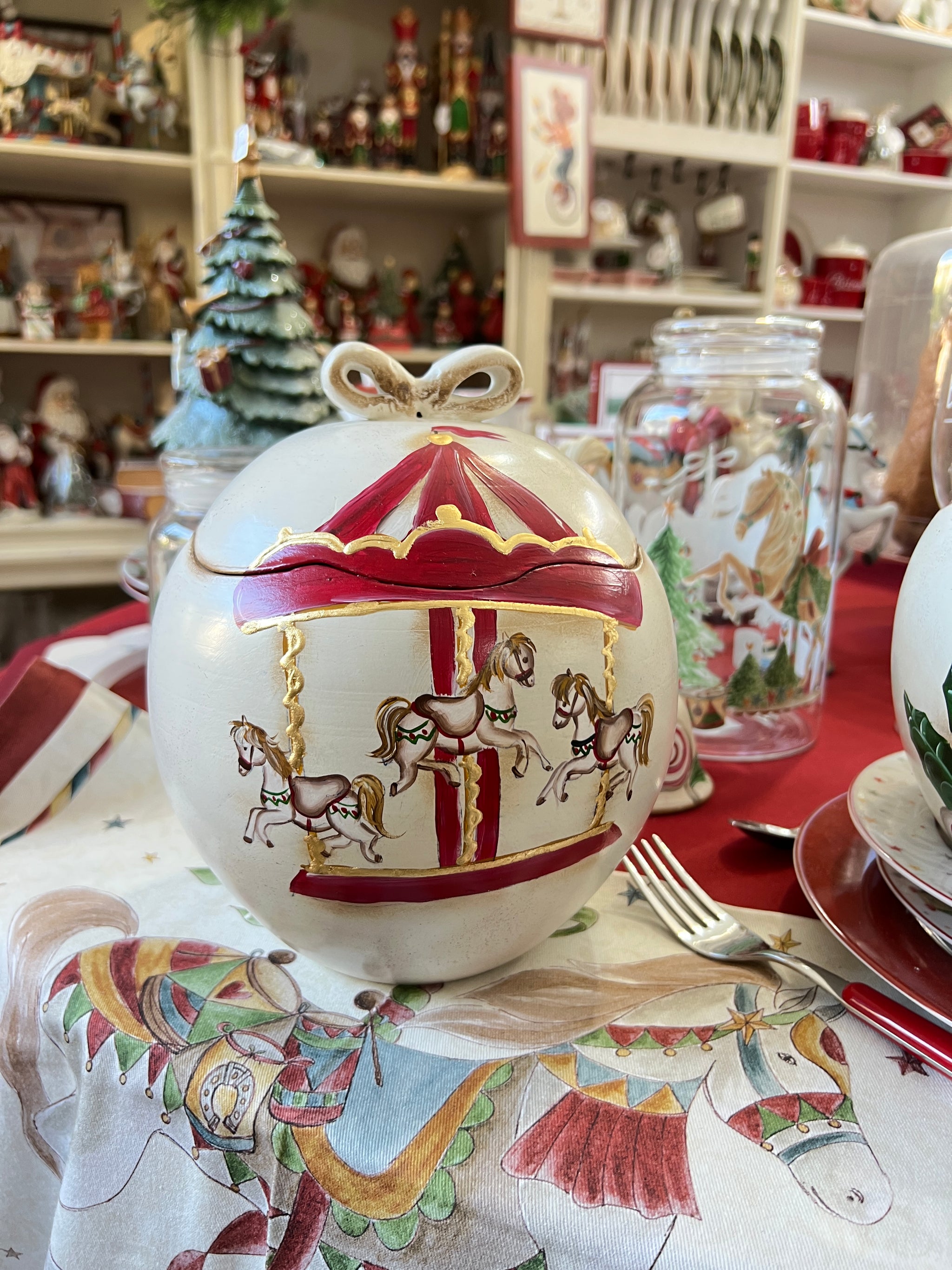 Biscottiera in ceramica con decoro giostra cavalli a dondolo dipinti a mano