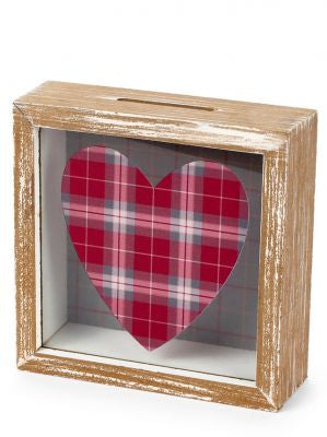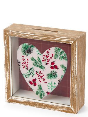Salvadanaio in legno con inserti in vetro decorato. Apribile nella parte posteriore. 14,5x5x14,5cm