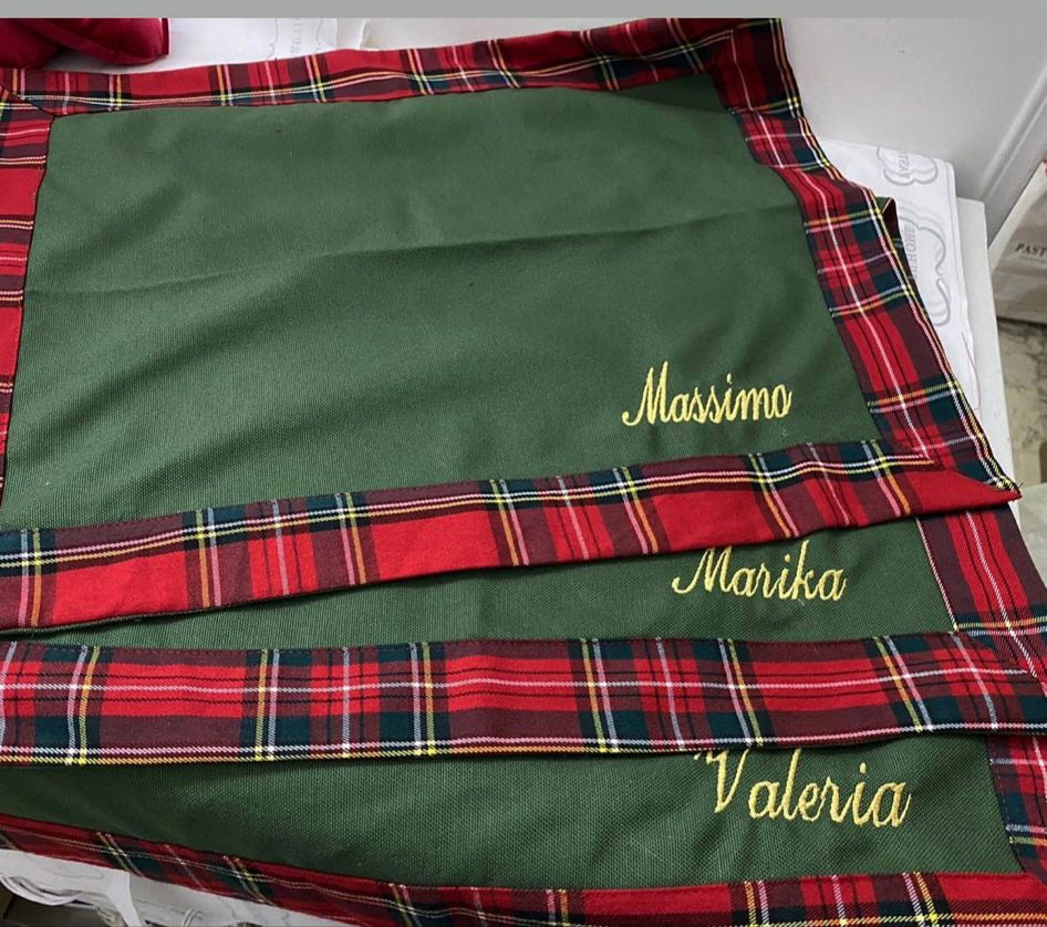 Tovaglietta tinta unita con bordo tartan,sartoriale. Compreso di ricamo